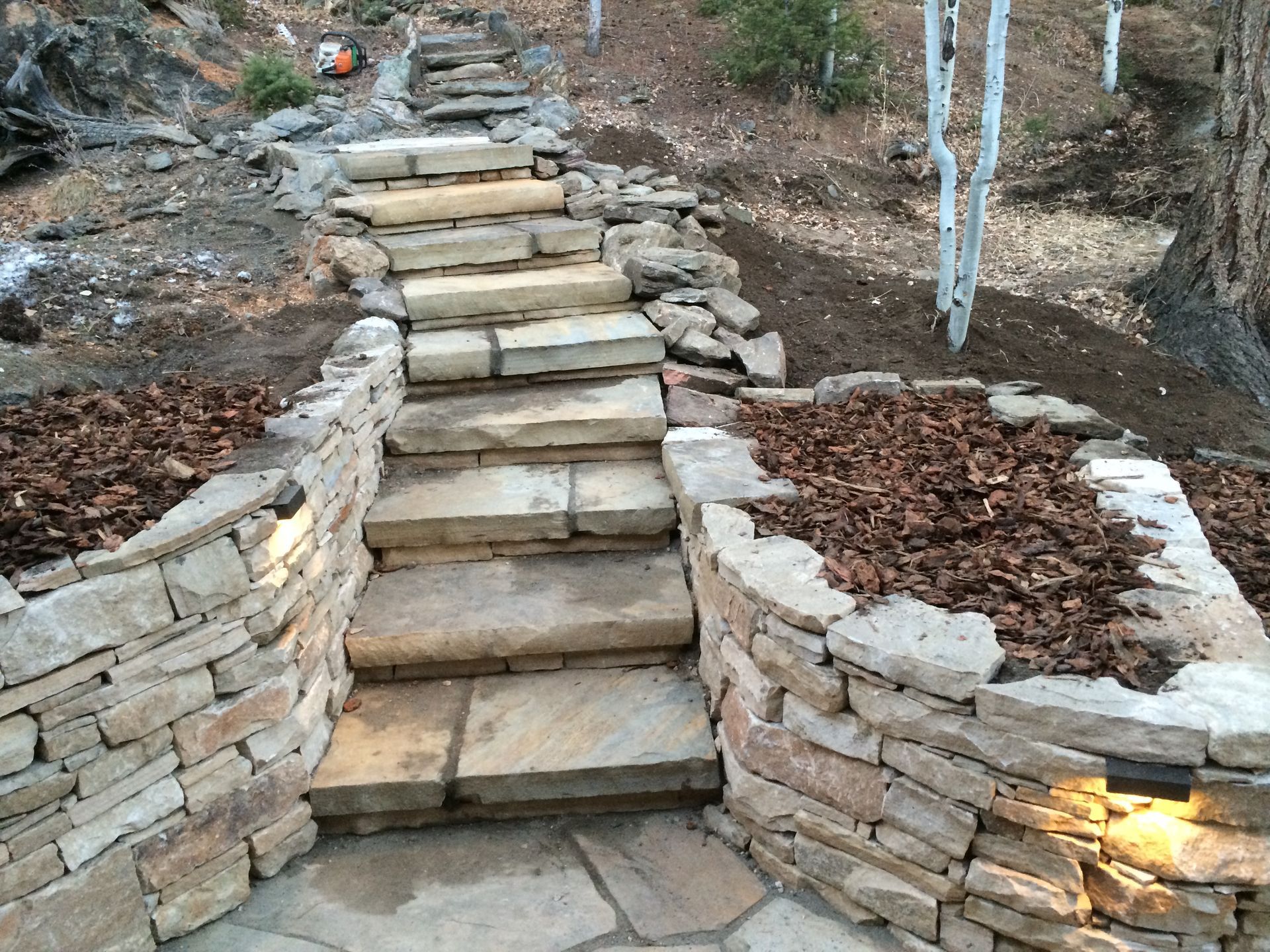The most natural look, we source stone slabs from local quarries to build rustic stairways. Local stones include Colorado Tan Buff and Colorado Red, among others.